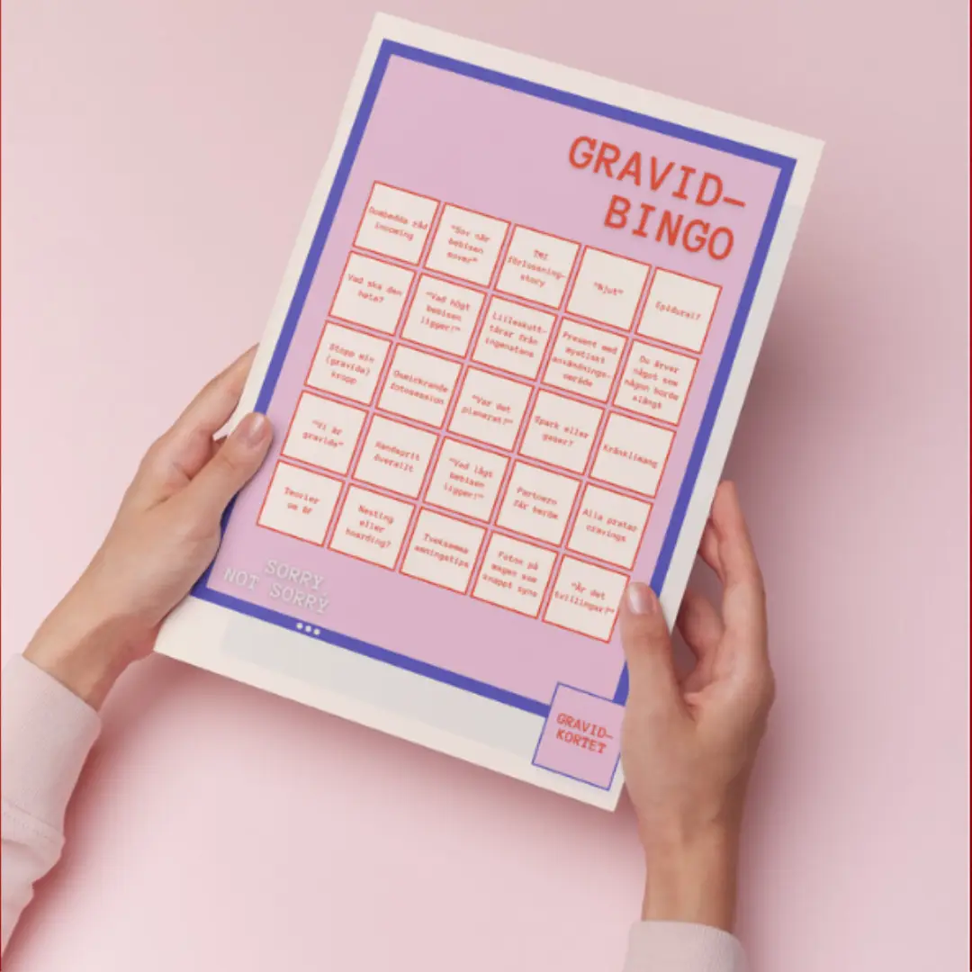 Gravidbingot är ett A5-ark med 25 klassiska graviditetssituationer — skriv ut, sätt upp vid skrivbordet och bocka av vartefter de inträffar. Vid bingo bestämmer du vad det kostar de skyldiga. Vi föreslår lunch.